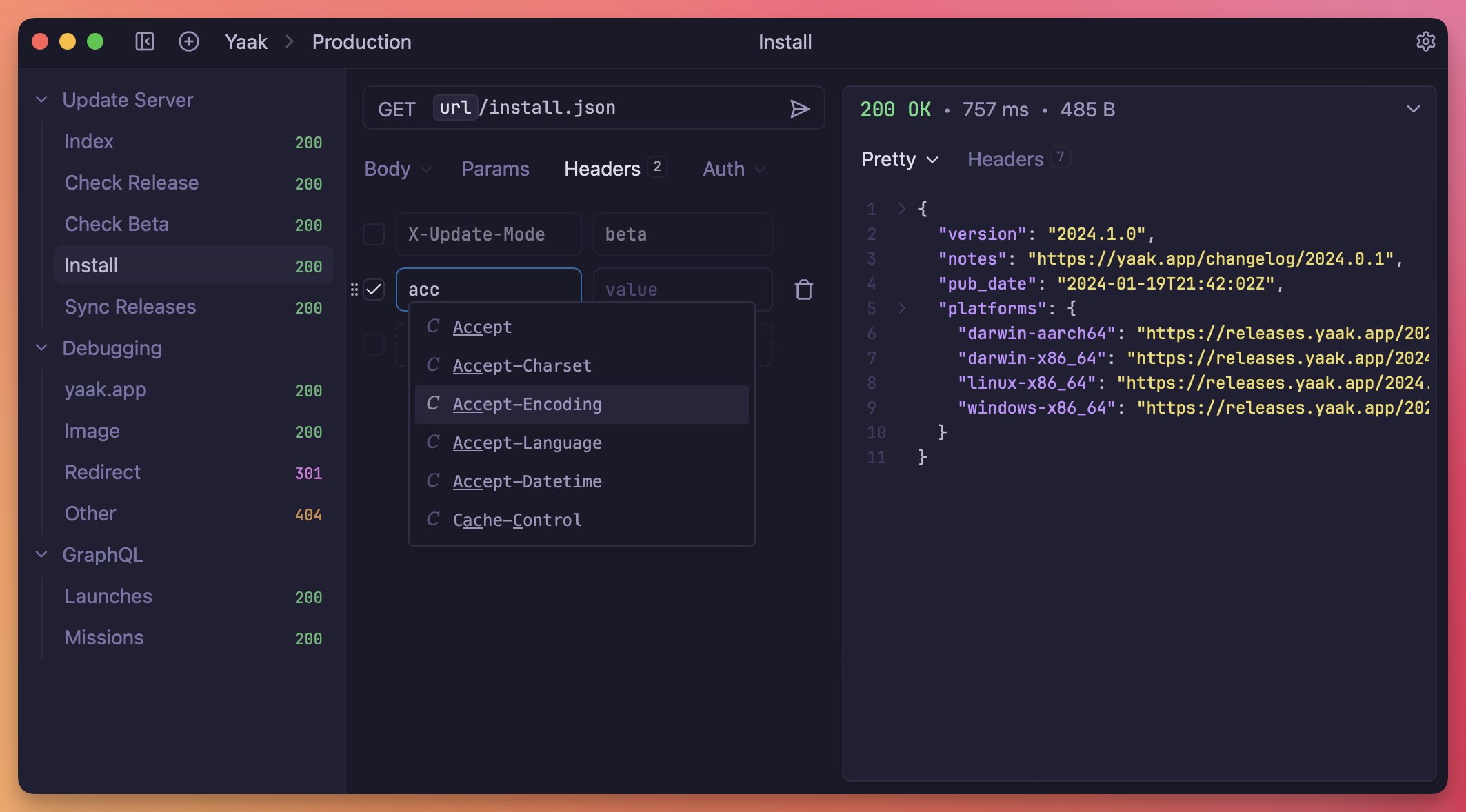 This is the initial public release of the Yaak desktop app! It’s still early and is not yet feature-complete so please head over to the Roadmap to see what’s upcoming and leave your own feedback.
