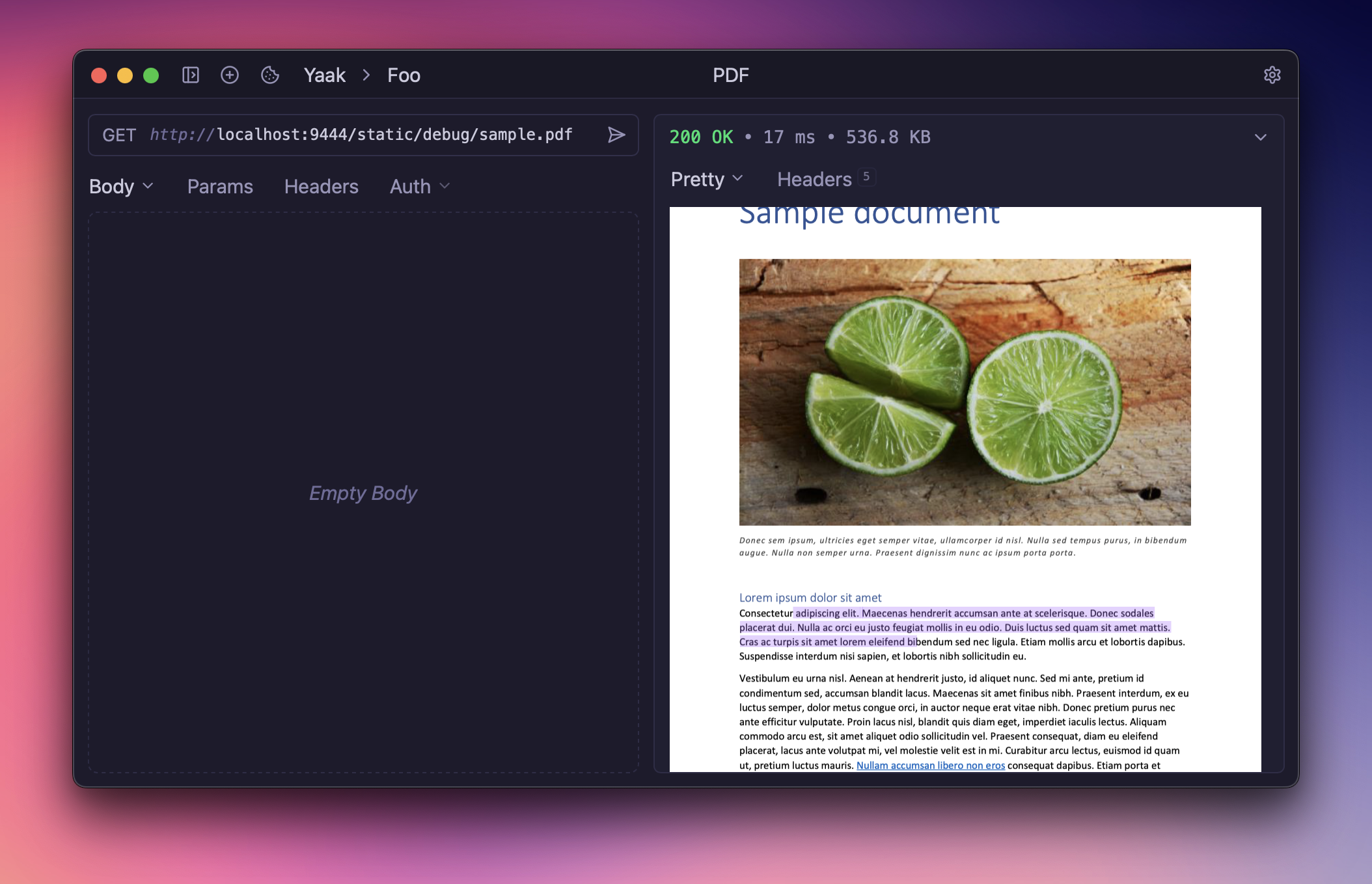 I know, I know, we all hate working with PDFs. But they’re a necessary evil when when working on payment systems (generating invoices), amongst other things. Now, if a response returns a PDF, Yaak will render a rich preview right in the response pane! Not only that, but text will be selectable and links clickable.