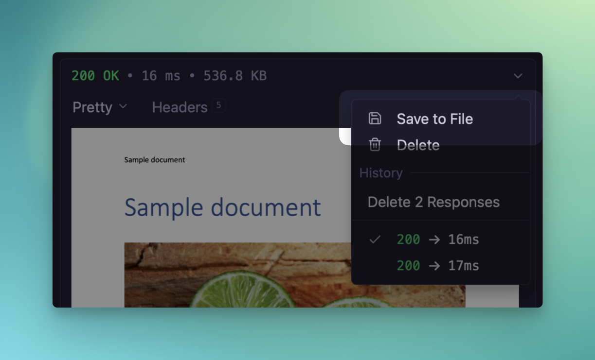 For these occasions, you can now save response bodies to your filesystem for use in other places. This action can be found in the response history menu for all HTTP responses and Yaak will even try to guess the correct file extension based on the returned mimetype.
