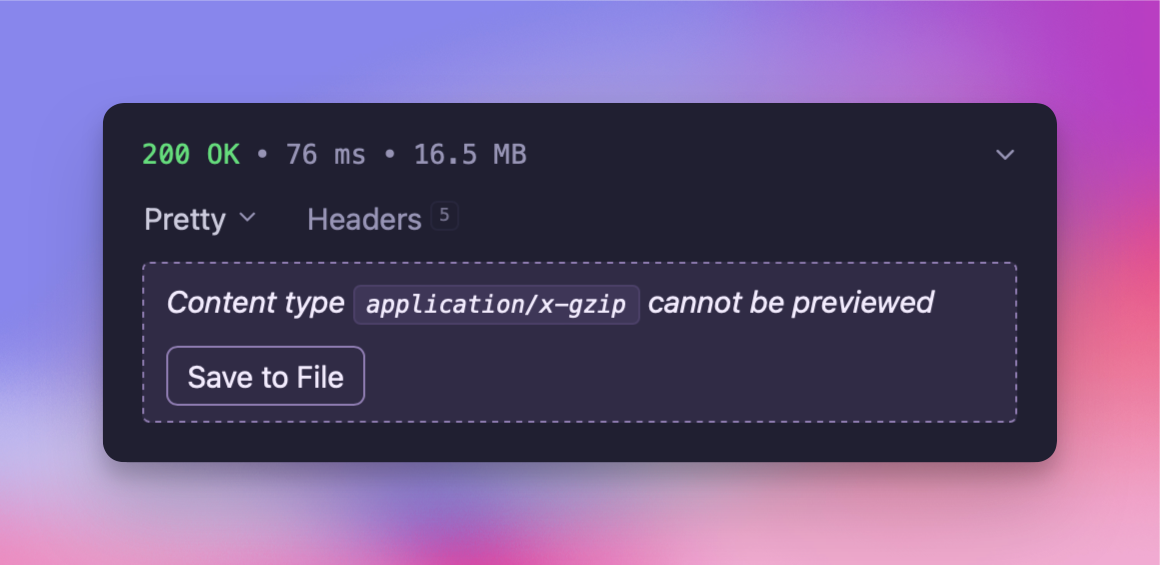 Oh, and one other thing. Previously, when Yaak encountered a mimetype it couldn’t preview, it would simply show… nothing. ๐คจ Now, when this happens, you’ll be presented with a prompt to save the response somewhere useful.
