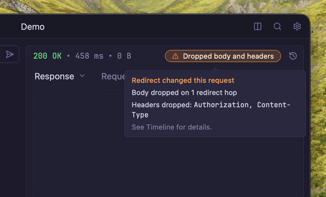 Yaak now shows a warning badge in the response pane when that happens. The timeline also includes the dropped header and body details so you can see which redirect caused the change.
