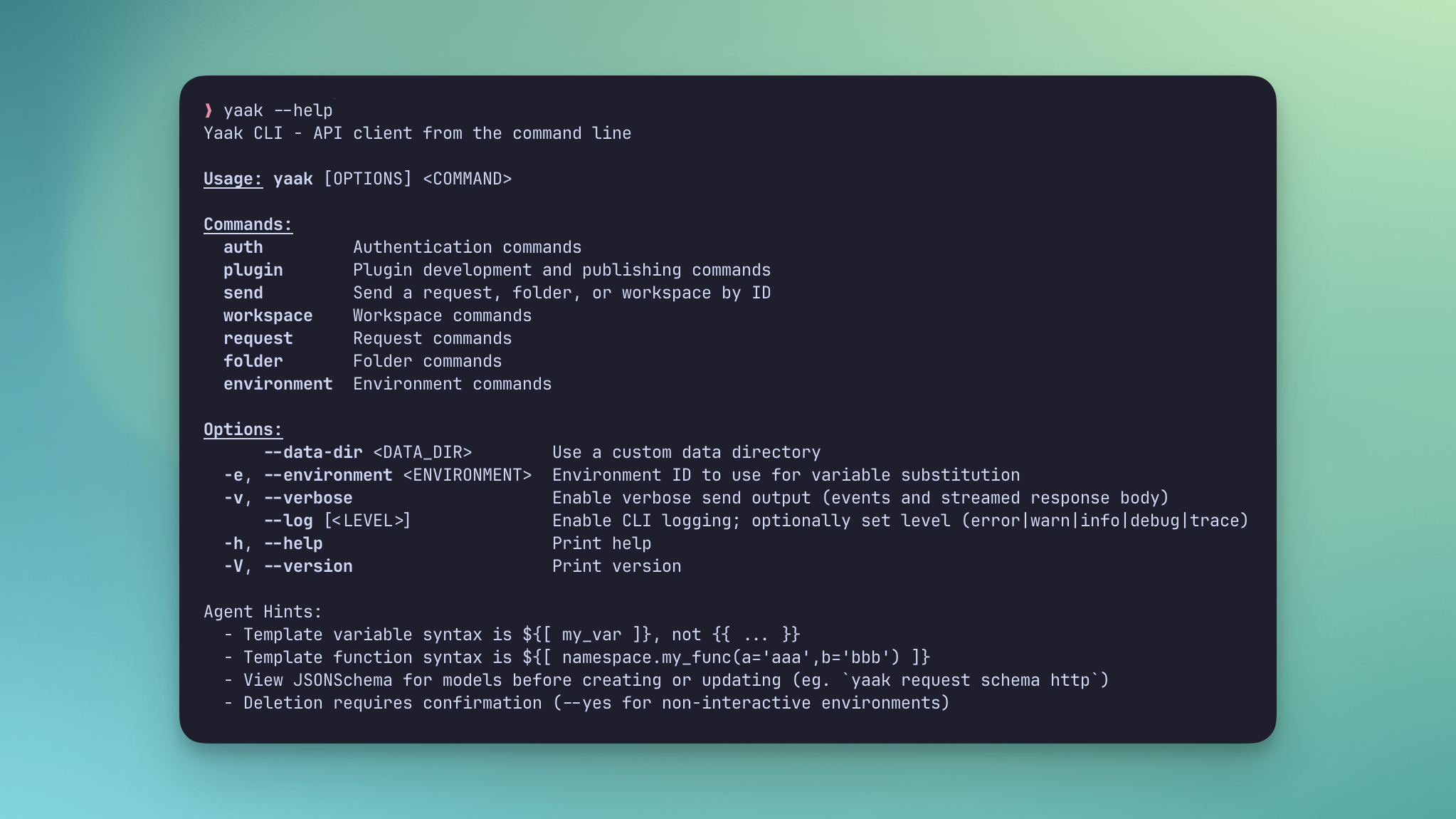 The new yaak CLI lets you manage workspaces, send requests, and inspect responses from the command line. It can be used directly by you, but is primarily designed for AI agents like Claude and Codex. Simply say “use the yaak CLI to…” and it will figure out the rest.