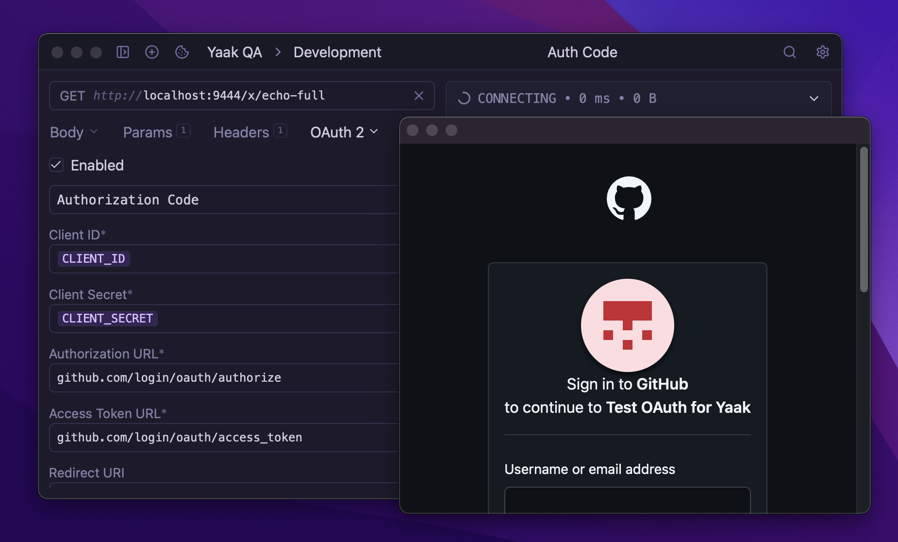 Yaak supports OAuth 2.0 and OpenID Connect (OIDC) authentication for APIs that require it. Configure your OAuth provider once, and Yaak handles token acquisition, refresh, and injection into requests automatically.