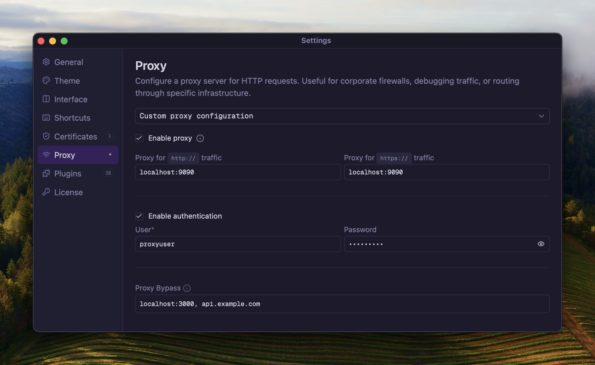 Proxy settings are global — they apply to all workspaces and requests. There is no per-workspace proxy configuration.