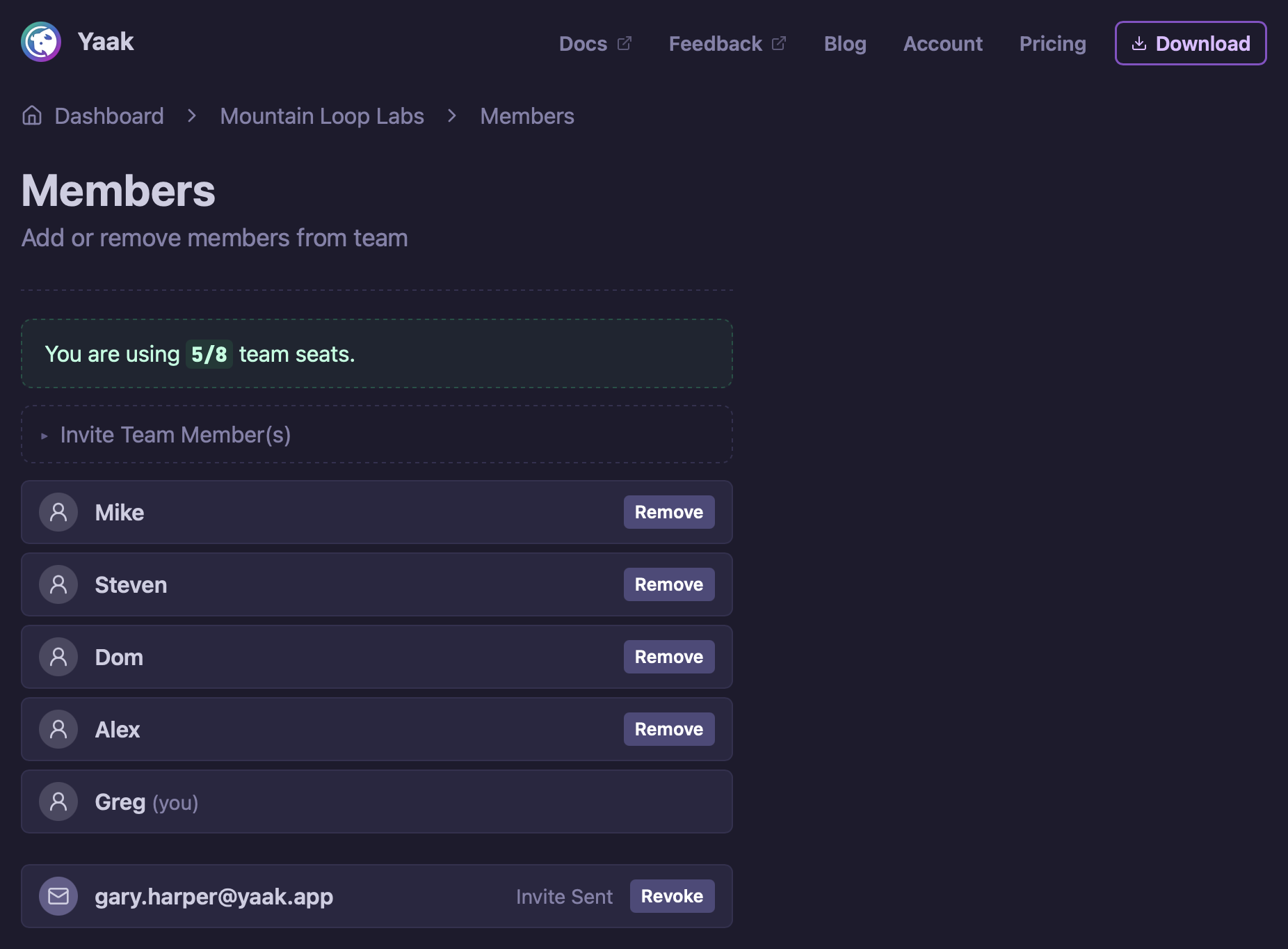 Each invitation contains a link to accept the invitation. Each member will need to create a Yaak account to accept the invitation. Once accepted, they will be presented with a unique license key, tied to their account, to be entered into the Yaak desktop application.