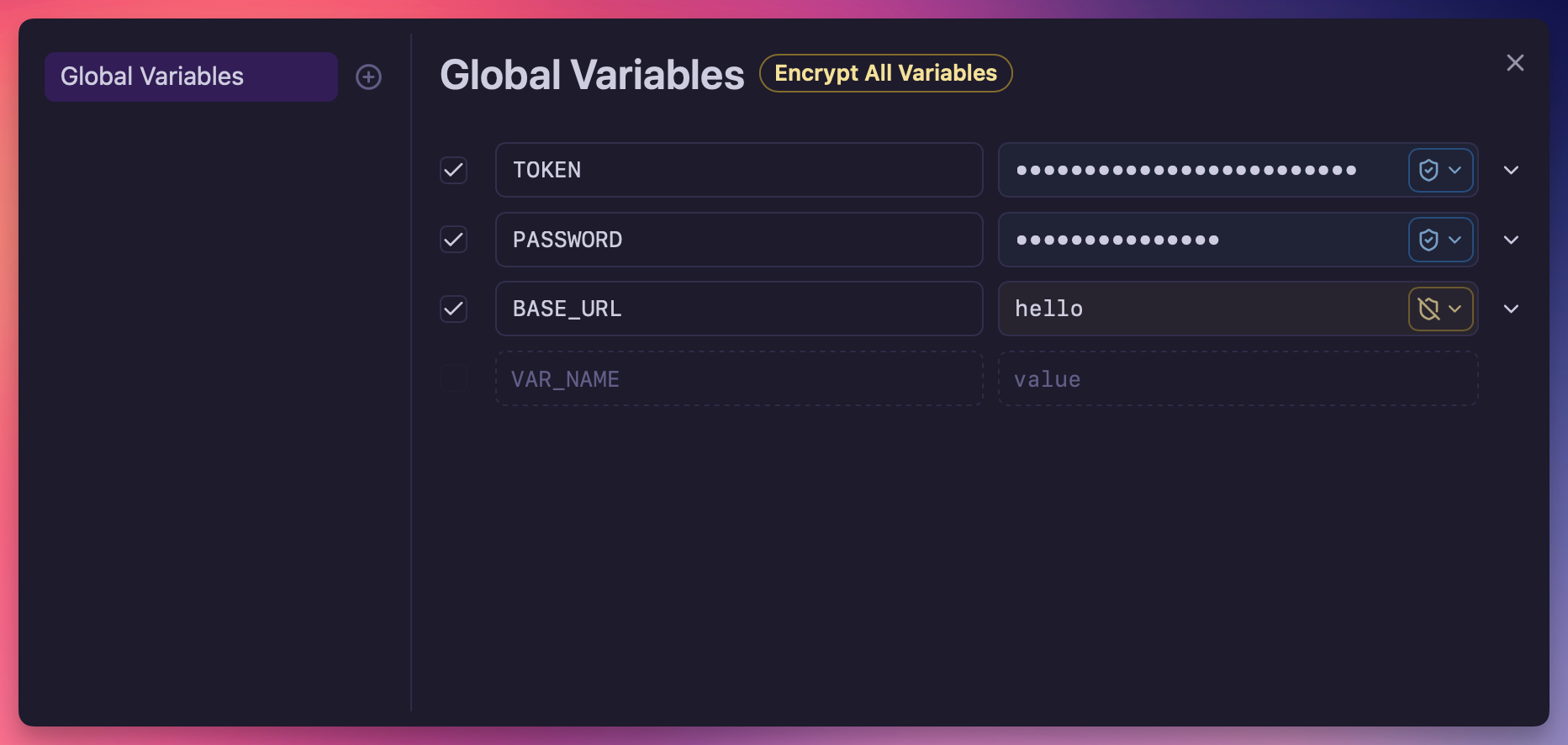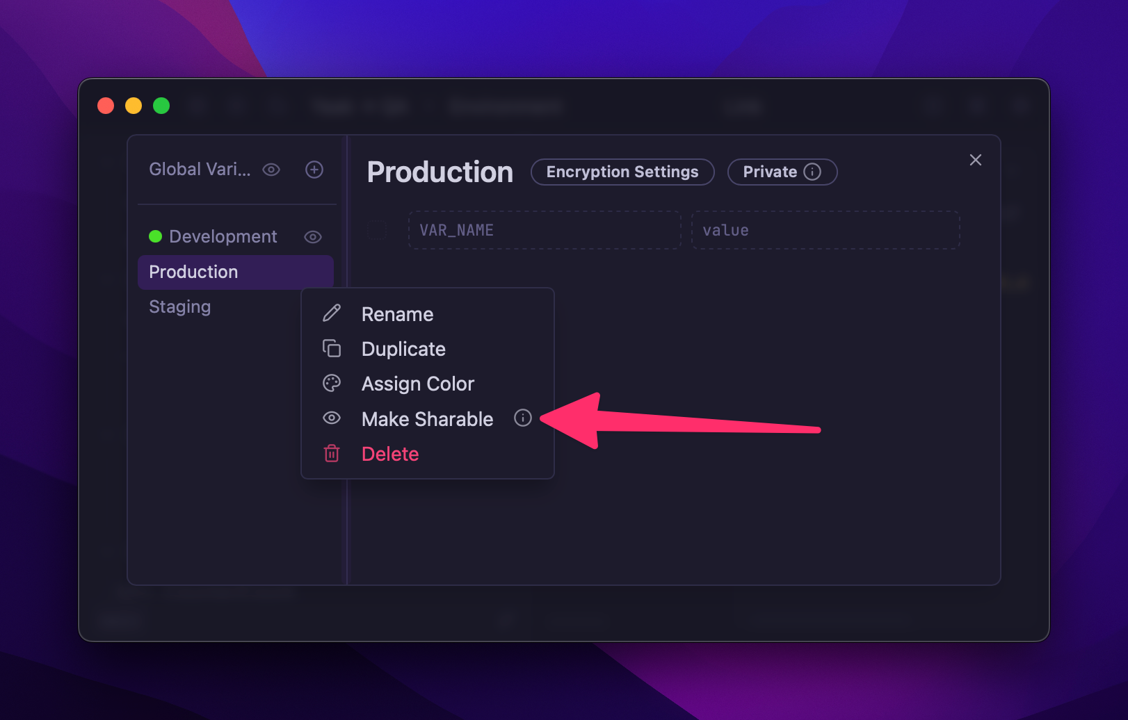 Environments can be marked as “sharable,” meaning they will be included in data export and directory sync by default. A warning will also appear if a sharable environment contains unencrypted values.