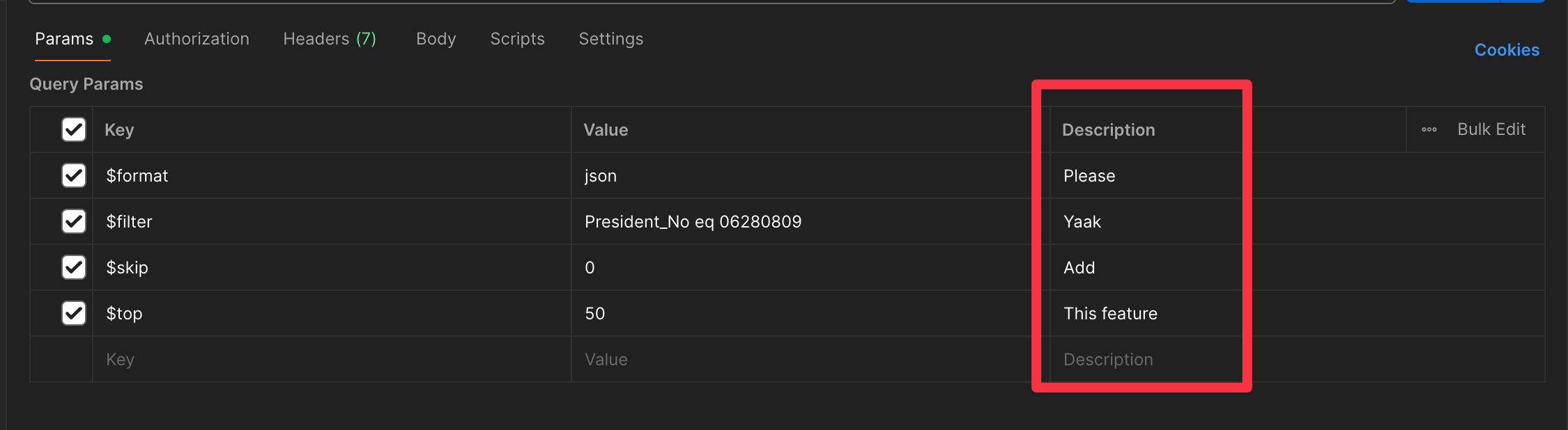 Insomnia and Postman both offer the description field, but neither supports editing it while bulk editing query params. Would love to see that option as well, as it’s quite slow to edit the fields in-line, especially for longer descriptions where the text requires scrolling.