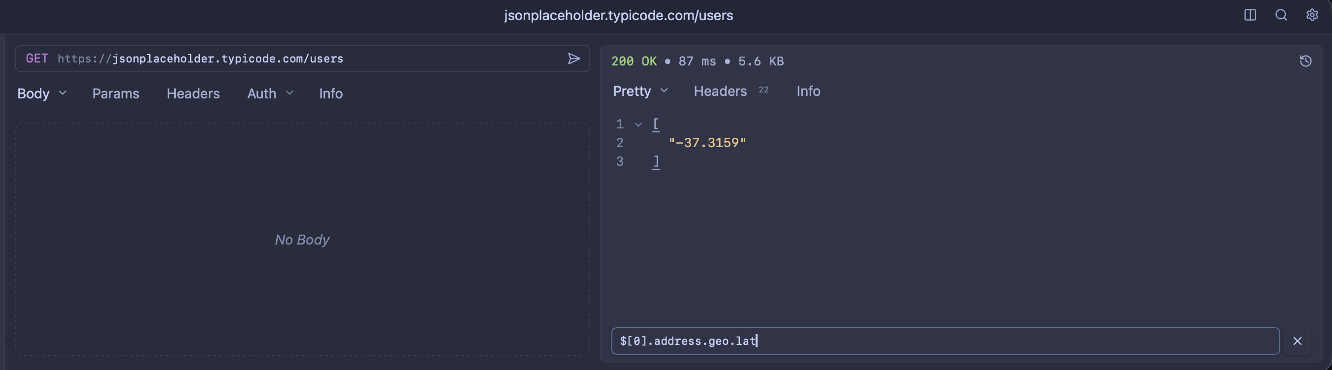 In the picture I have my cursor over the lat key in the first item of the response array. Something like $[0].address.geo.lat someowhere in the UI would be awesome.