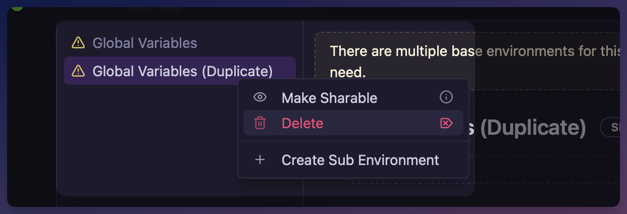 Just got this error message, but I cannot find any button or functio in the GUI to actually delete the duplicate base environment, and I can’t see any duplicates in the files either. Please advice how to clean this up.