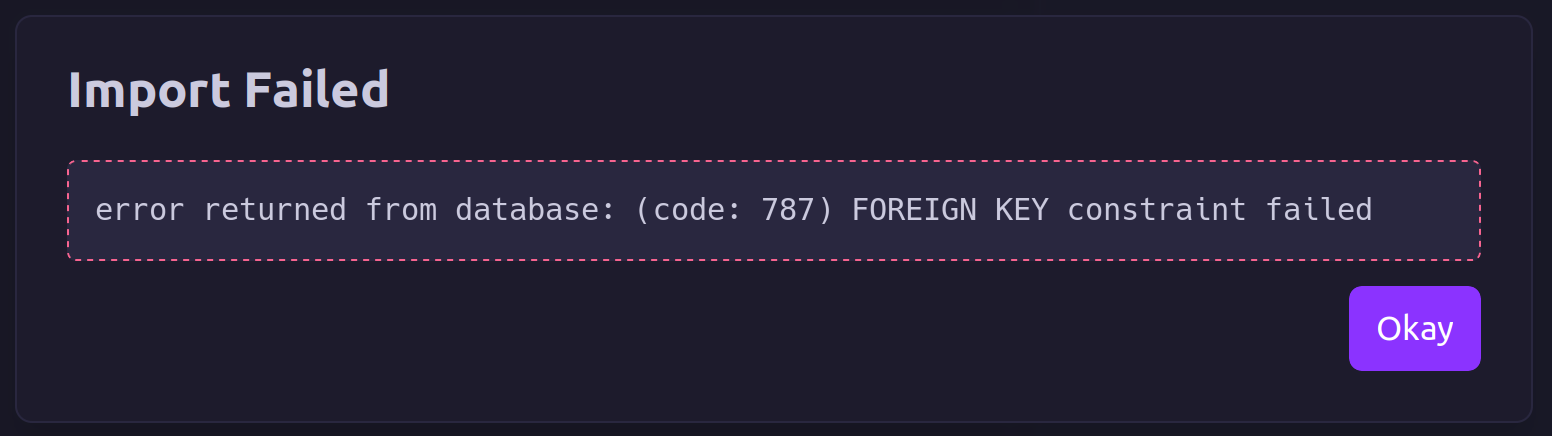 nit: it would be nice if the backend errors were logged somewhere. I managed to debug this through trial-and-error and inspection of the SQLite DB but having access to the actual SQL error message would have made this a fair bit easier.