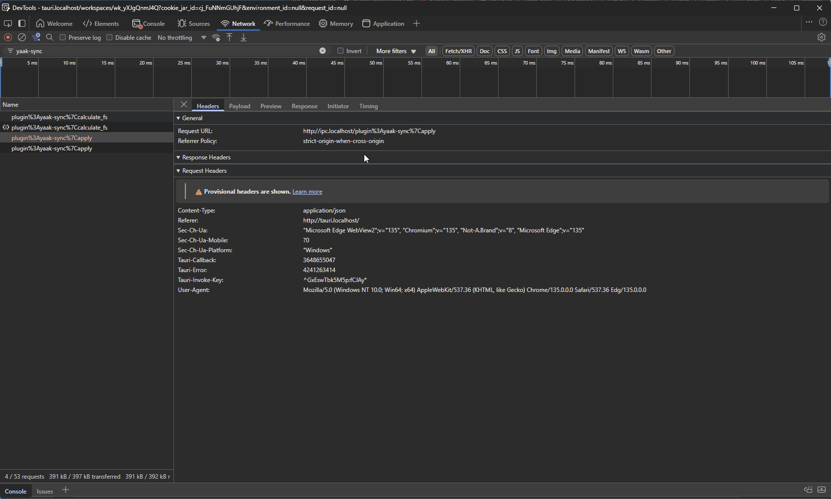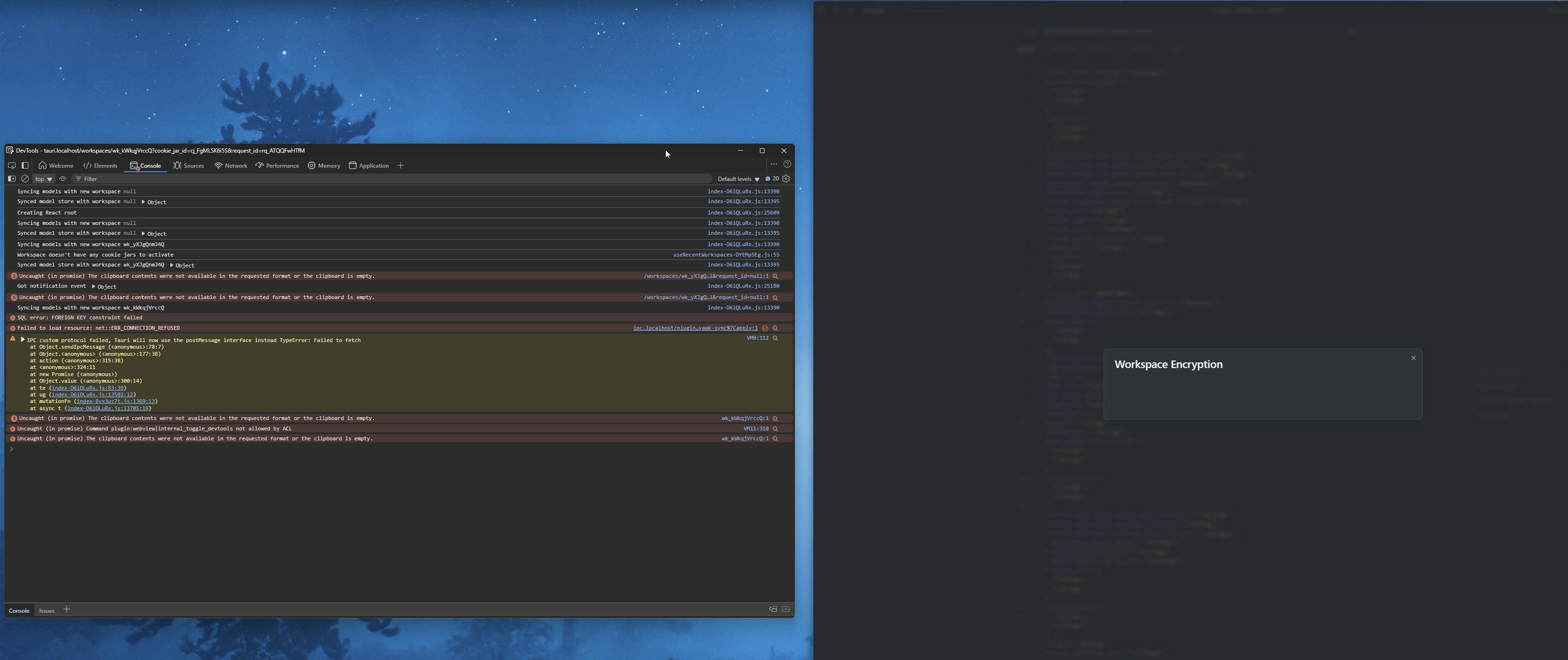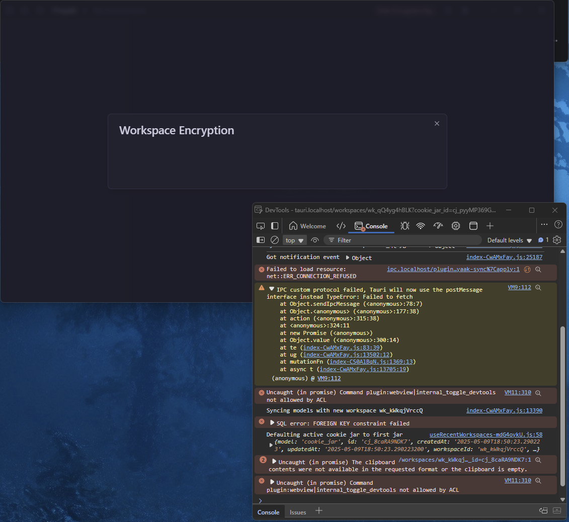 In that screenshot, was the console open when you did the “Open Existing Workspace” action? Can you also try looking at the Network tab in devtools (filter by “yaak-sync”) to see if there are any errors?